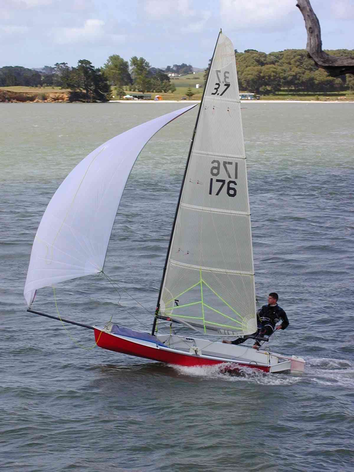 The 3.7 is a single handed trapeze centreboarder, with hard chine, rounded sections, full bow, straight run, and generous beam. The rig is set well aft – 4 ft. from the stern with 1 ft 9 inches of rake. This makes for easy trapezing with no bow dipping tendencies. The overall length was decided on as being the nearest metric conversion of the optimum of 12 ft. This also makes the boat easy to store and tow, or carry on a roof-rack. It is also suitable for sailing both on the sea and on restricted inland waters.