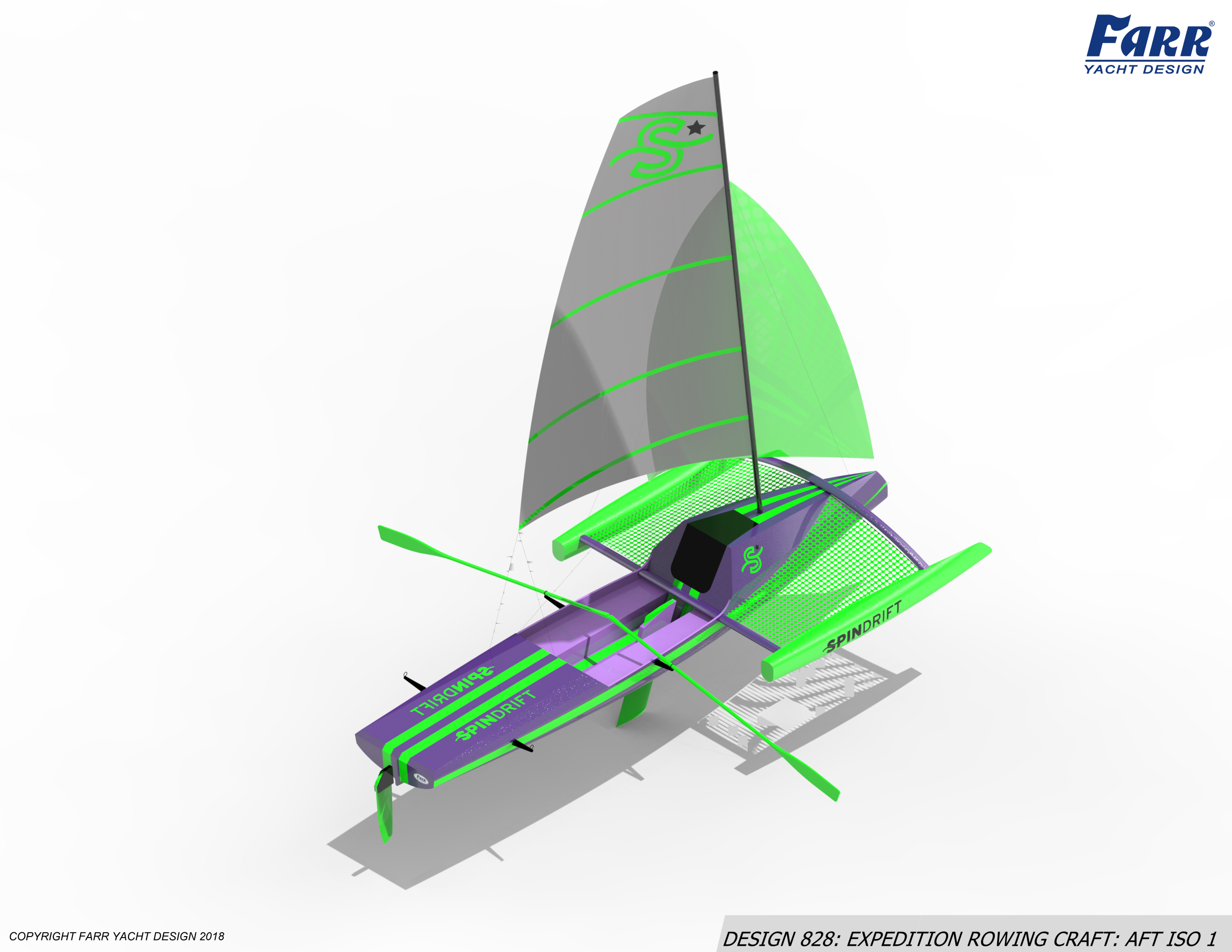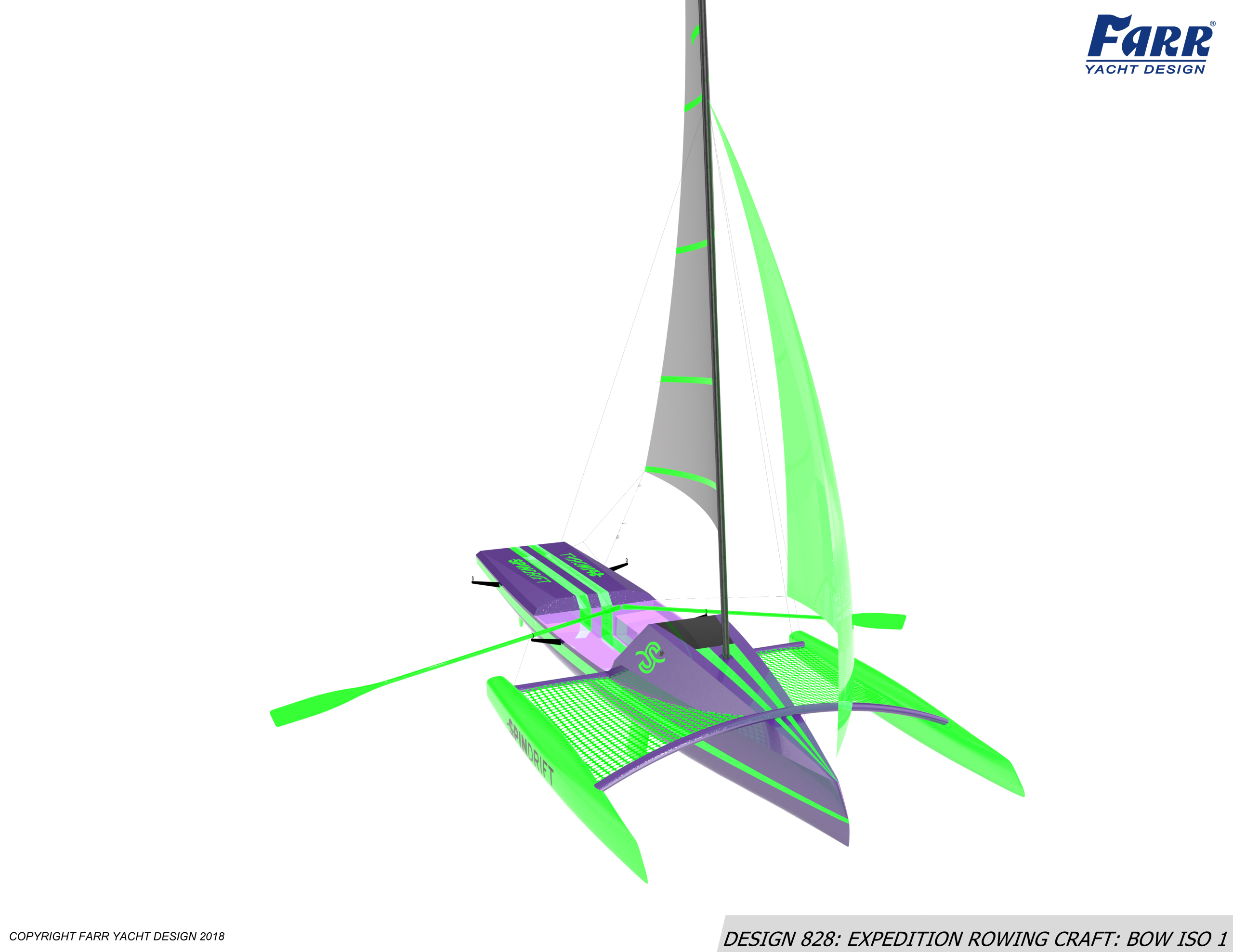 This Expedition craft was commissioned in 2017 by Spindrift Rowing. Designed for coastal and ocean rowing in single or doublehanded configurations the boat can be easily moded for sailing with the addition of the ama’s and rigging. The boat is constructed from infused Carbon Foam with additional abrasion protection engineered into the laminates.